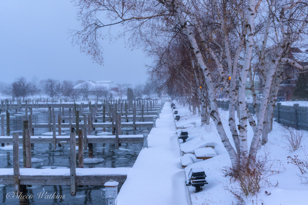 The docks sat empty, lines frozen in place. Birch trees stood tall and bare, their pale trunks offering contrast against the subdued sky. A narrow path stretched forward, untouched, leading towards the edge of town towards the lake. There were no people, no passing cars — only wind, water, and the hush that only winter brings.